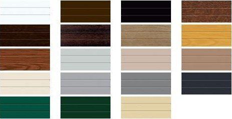 Anthrazit Grau in Holzstruktur oder Orangenschale Struktur, Golden Oak, Nussbaum, Mahagoni, Mooreiche, Macore, Winchester, Moosgrün, Tannengrün, Meranti, Schokoladebraun, Schwarzbraun oder in jeder RAL Farbe.
